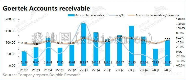 ①应收帐款:歌尔股份 2024 年第二季度应收帐款 111.8 亿元,同比下滑 14.5%。从应收帐款/营业收入指标看,歌尔股份本季度为 0.53,维持在相对合理水位。