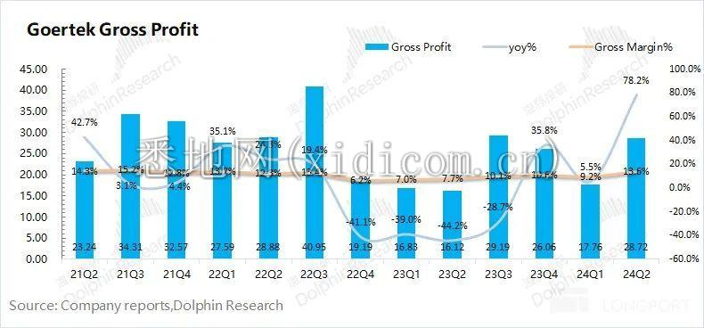 歌尔股份 2024 年第二季度实现毛利 28.7 亿元,同比增长 78.2%,毛利的增长主要由毛利率提升所致。
