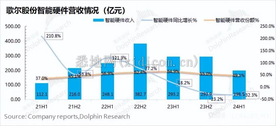 歌尔股份智能硬件业务 2024 年上半年实现收入 199 亿元,同比下滑 32.3%。公司硬件业务的减少,主要是受 VR 等虚拟现实等产品下滑的影响。