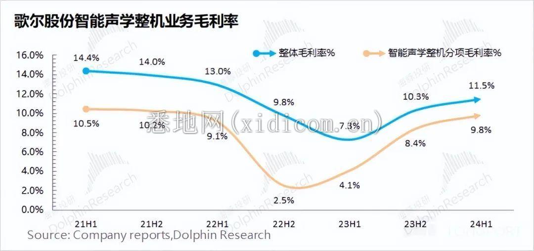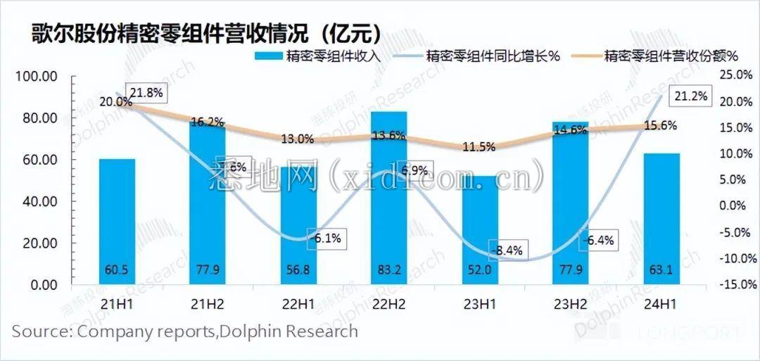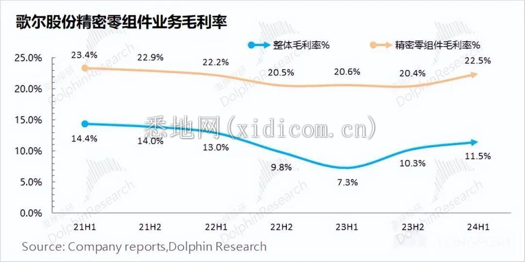 歌尔股份精密零组件业务 2024 年上半年毛利率为 22.5%,同比提升 1.9pct。公司精密零组件毛利率继续稳定在 20% 上方。