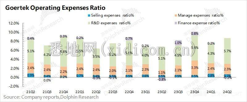 2024 年第二季度歌尔股份四项费用合计 18 亿元,同比增长 44%。四项费用率 8.5%,费用率处于相对合理水平。