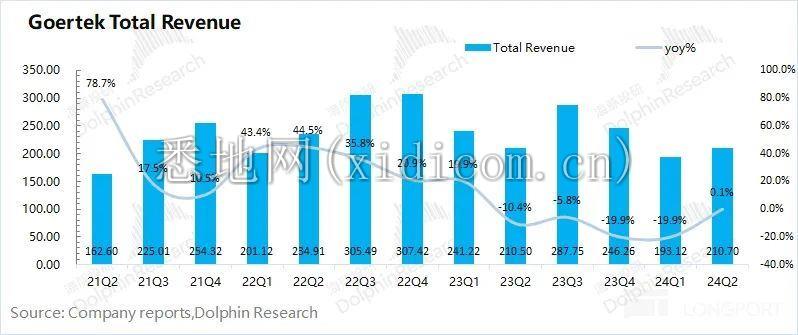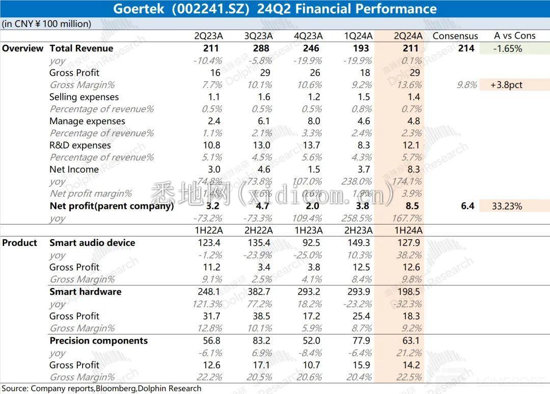 歌尔股份 2024 年第二季度总营收 211 亿元,同比增长 0.1%,略低于市场预期(214 亿)。营收端开始企稳,主要受智能声学整机和精密零组件业务回暖的带动。