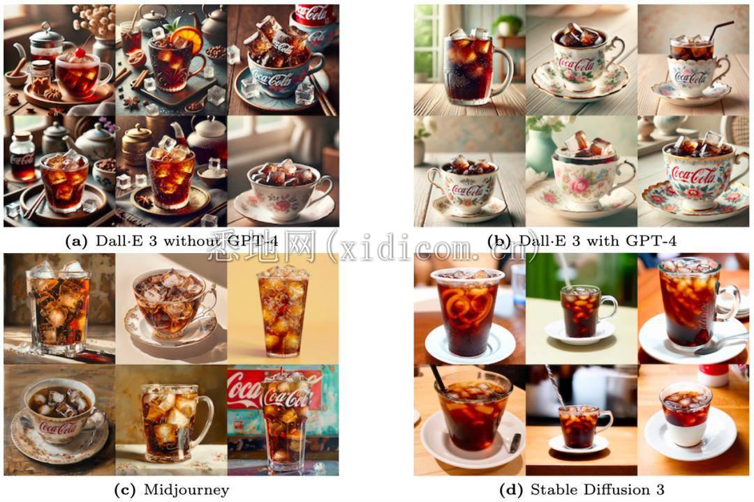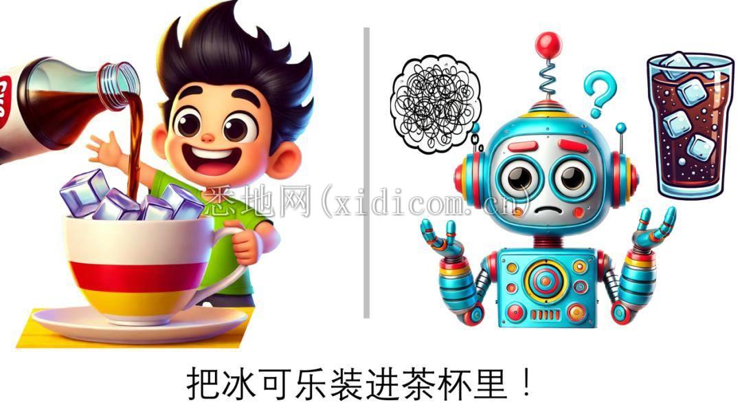 设想一下,如果让你画一幅 “茶杯中的冰可乐” 的图片,尽管茶杯与冰可乐的组合可能并不恰当,你仍然会很自然地先画出一个茶杯,然后画上冰块与可乐。那么,当我们给 AI 画家提出 “画出茶杯中的冰可乐” 的要求时,会发生什么呢?在 2023 年 10 月大规模 AI 图像生成模型刚刚兴起时,我们便进行了这种尝试,得到了以下结果: