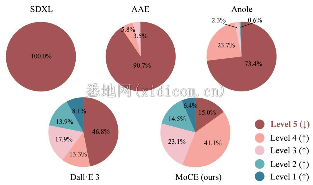 最后,我们使用 MoCE 以及各种 baseline 模型在收集到的数据集上进行了广泛的实验,并展示了以 “茶杯中的冰可乐” 为首的可视化修复结果,以及在整个数据集上人类专家评估的结果对比。和几种 baseline 模型相比,我们提出的 MoCE 方法显著地降低了第 5 级 LC-Mis 概念对的占比。另外值得注意的是,MoCE 的性能在一定程度上甚至超越了需要大量数据标注成本的 Dall・E 3(2023 年 10 月版本):