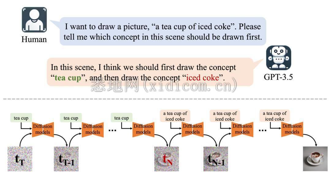 为了找回图像中的茶杯,我们提出了一种名为 Mixture of Concept Experts (MoCE) 的方法。我们认为,如果不从人类处理问题的角度来进行思考,那么人工智能的一切都是毫无道理的。在当今最火热的文生图模型 diffusion models 中,注意力机制会同时处理文本提示中的可乐与茶杯,但这并不符合人类按照概念顺序作画的规律。因此,我们将顺序作画的规律融入到 diffusion models 的多步采样过程中,成功地将消失的茶杯找了回来: