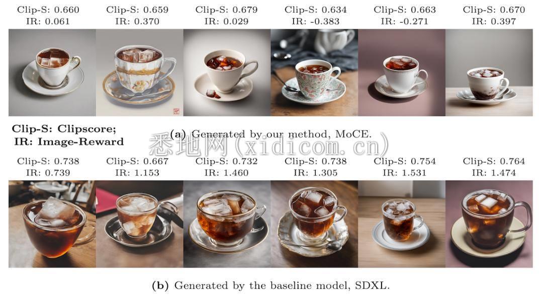 此外,正如在上文中提到的,现有的自动化评价指标在 “茶杯中的冰可乐” 这一新问题上存在一定缺陷。我们首先仔细挑选了一些带把的透明玻璃杯图像,它们虽然具有茶杯的形状,但是由于其透明玻璃的材质而不能称之为茶杯。我们将这些图像与 MoCE 生成的 “茶杯中的冰可乐” 图像进行了对比,如下图所示: