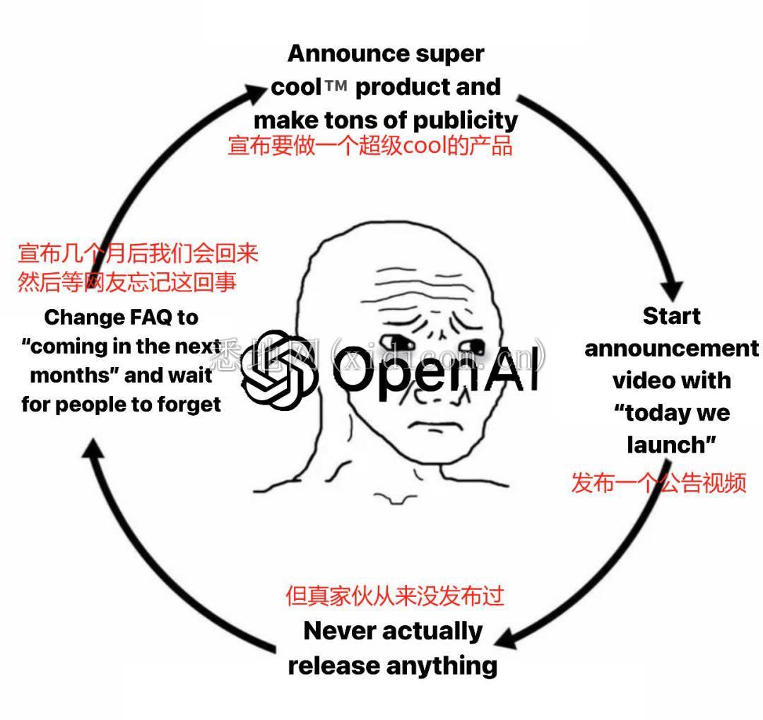 有网友做了一张梗图,完美展示了OpenAI的画饼行为。
