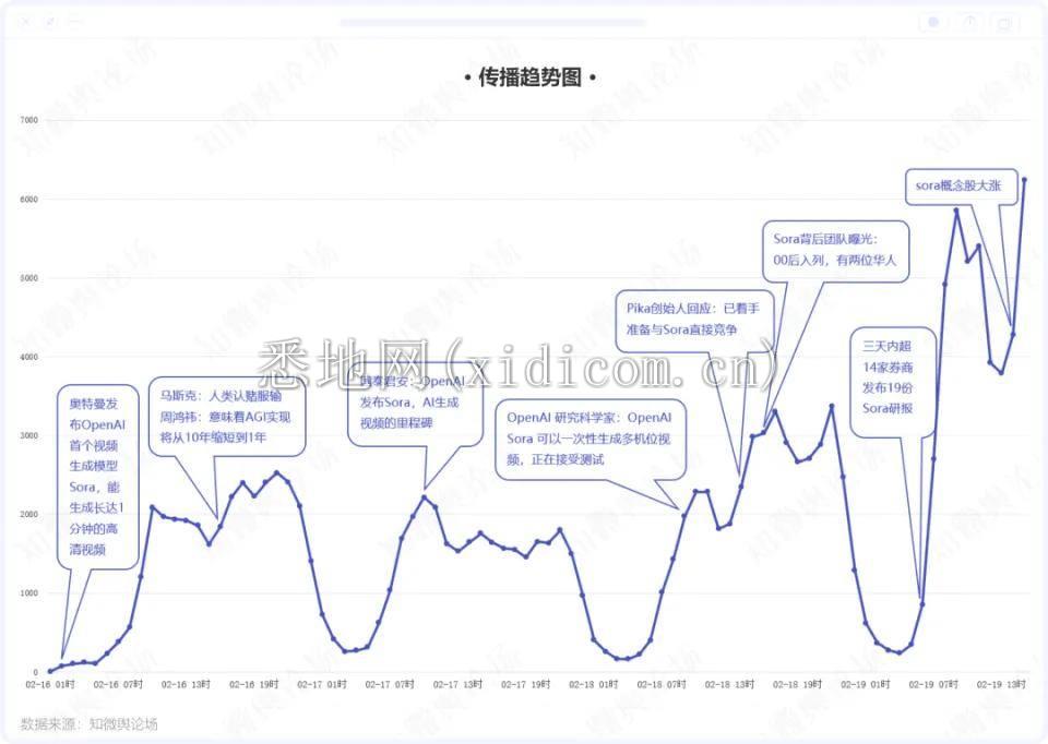 今年2月份,Sora发布时,其热度可以用炸裂来形容。根据知微数据,“Sora"发布首日上榜热搜32次,累计热度6600万。5日内,相关话题上榜热搜超百次。