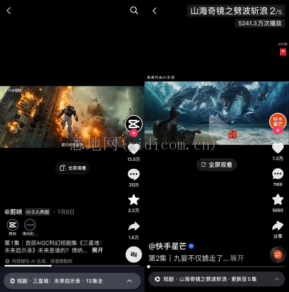 6月,中央广播电视影视剧纪录片中心在央视频上线了3部AI短剧《英雄》《爱永无终止》《奇幻专卖店》。7月,抖快狭路相逢,“即梦”对战“可灵”,前者拿出了与电影公司博纳合作的《三星堆:未来启示录》,后者拿出了扶持新人导演的《山海奇镜之劈波斩浪》。