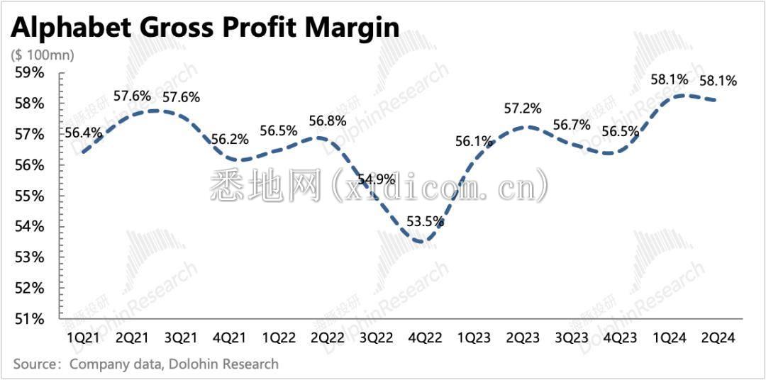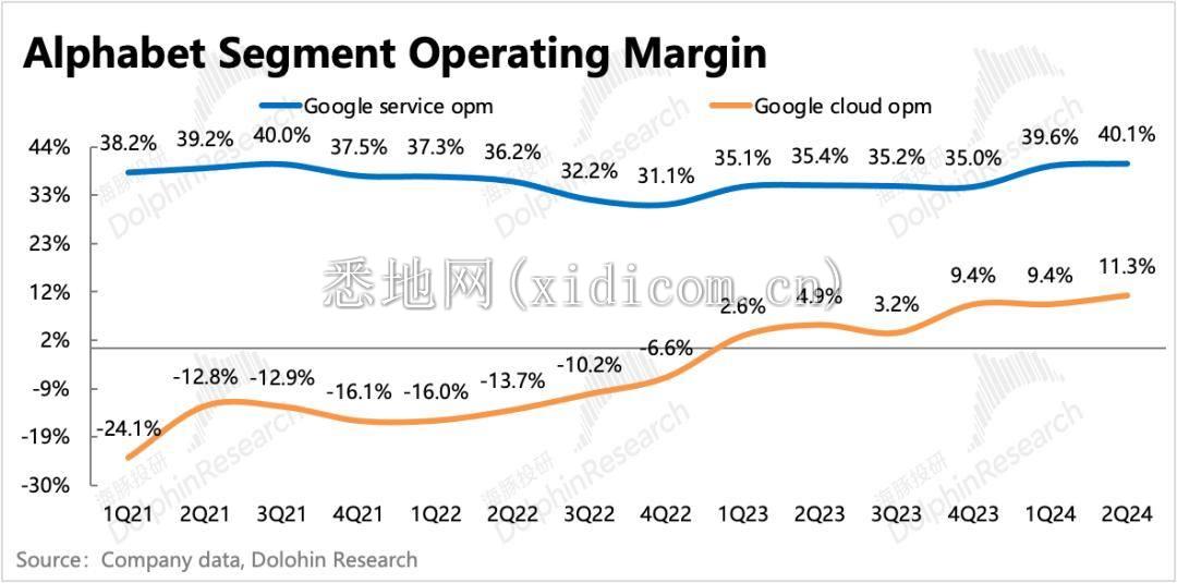 以广告为主的Google Services和Google Cloud两大业务部门,二季度经营利润率均有提升,其中云部门的盈利改善显著超出市场预期,Google Services的经营利润率也小幅提升到近三年新高。