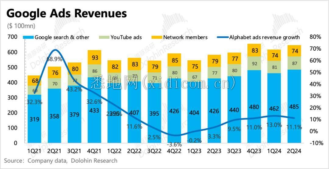 二季度广告收入646亿,整体增长11%,因为去年Q2中国跨境电商开始投放,进而带来的高基数影响,增速相比一季度略有放缓。虽然整体上符合预期,但主要来自于搜索广告的贡献,YouTube表现平平,而联盟广告收入持续恶化。