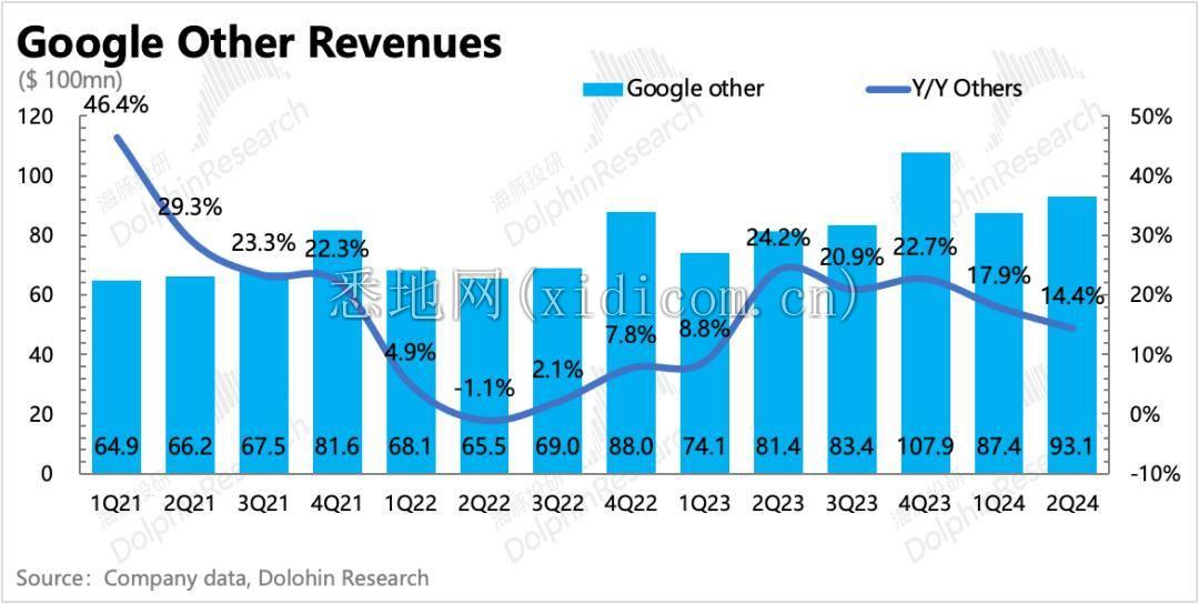(3)其他业务:二季度增速进一步放缓,同比增长14%。这部分收入主要由YouTube订阅(TV、音乐等)、Google Play、Google、One、硬件(手机Pixel和智能家电Nest)等组成。