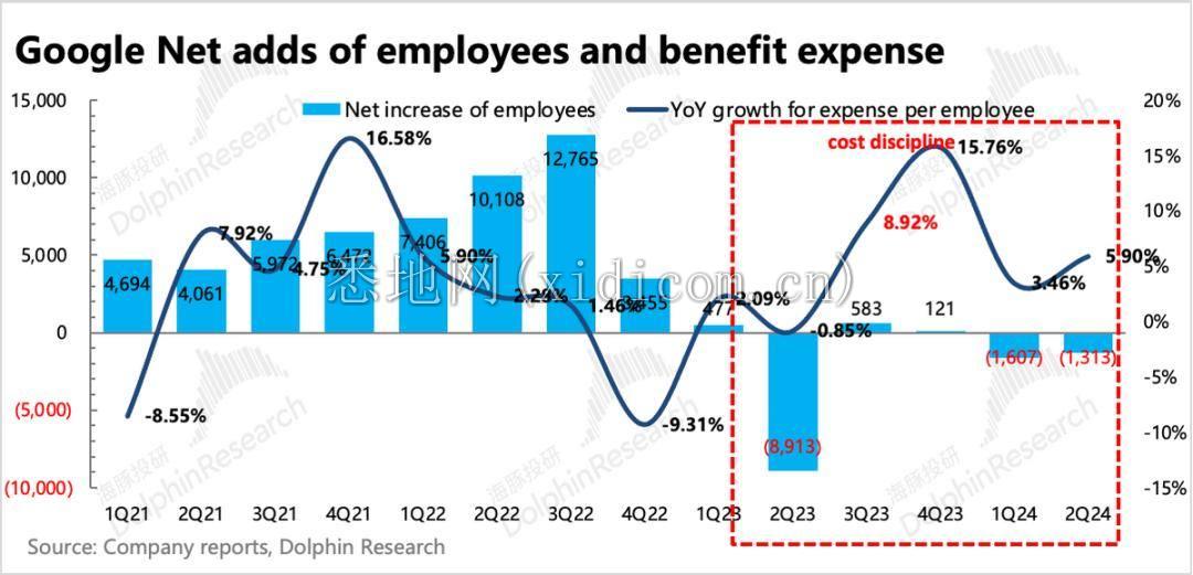 谷歌二季度的收入仅仅是达标,因此利润表现不错源于成本费用上的优化。具体拆分来看,成本优化主要体现在流量成本上,费用优化则主要是裁员、法律相关支出减少,从而压缩管理费用。