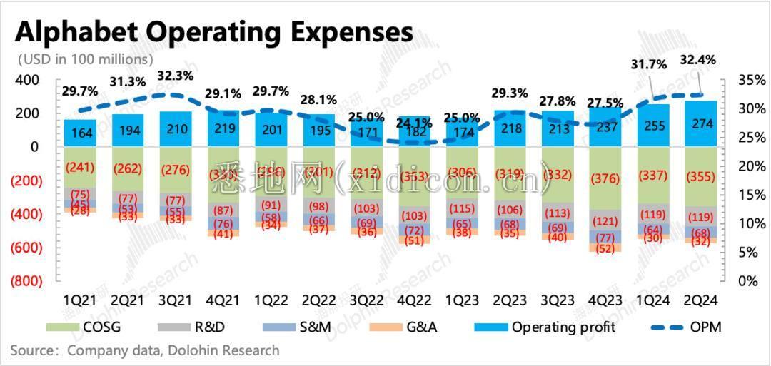 从业务角度划分,Google Services经营利润率上浮了0.5pct。Google Cloud业务也重新开启盈利改善的节奏,OPM环比提升2pct。而这两块在财报前市场出于对AI成本增量的考虑,虽然也预期还会进一步改善,但都不算高。