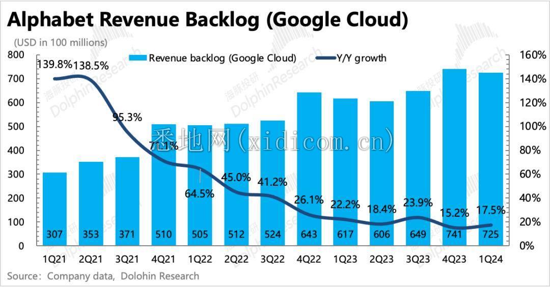 因此海豚君一般还是会通过谷歌的Revenue Backlog指标来判断短期趋势。这个指标中大部分是来自云业务,因此它的变化趋势也可以视作云业务的未履约合同量的变化趋势。