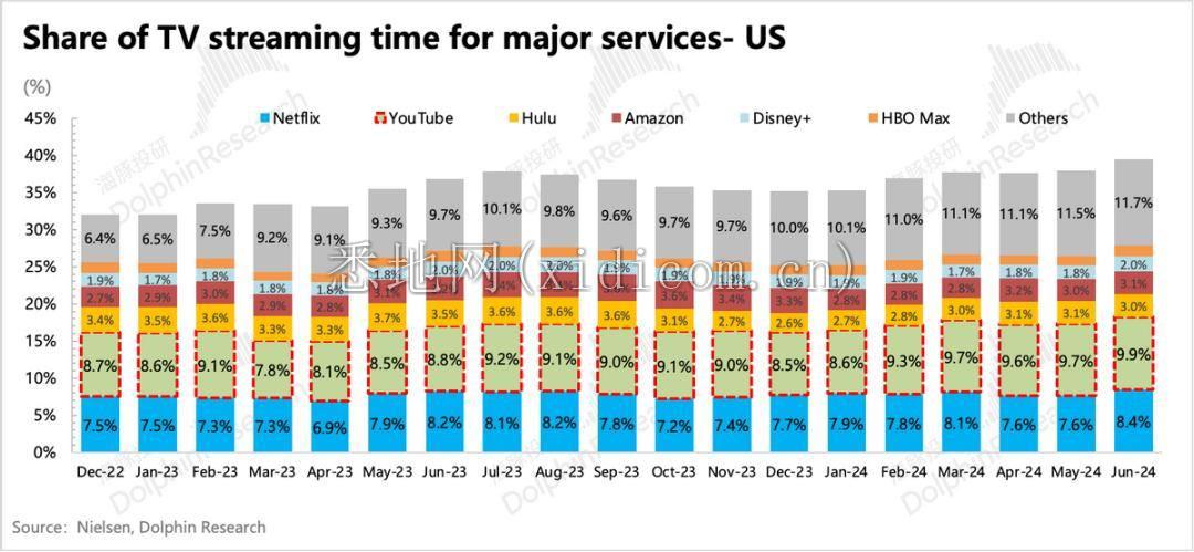 此外YouTube TV可能也受到了来自Netflix和Amazon prime的影响。虽然YouTube TV的收视份额持续有优势,但Netflix和Amazon Prime TV以往并没有推行广告变现,因此过去并不存在广告上的竞争,但现在YouTube TV也需要打起精神应对。