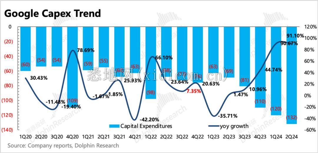 但坏的是(1)市场原本看好的YouTube广告表现显著低于预期;(2)资本开支超出市场预期,引发市场对未来利润率承压的担忧。