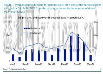 报告数据显示,今年一季度,美国AI初创公司获种子轮(及此前)融资骤降至1.23亿美元,同比下滑70%,几乎回到了2022年ChatGPT问世前的水平。此外,这些美国AI初创公司一季度的融资交易数也环比减少了一半以上,由74笔降至34笔。
