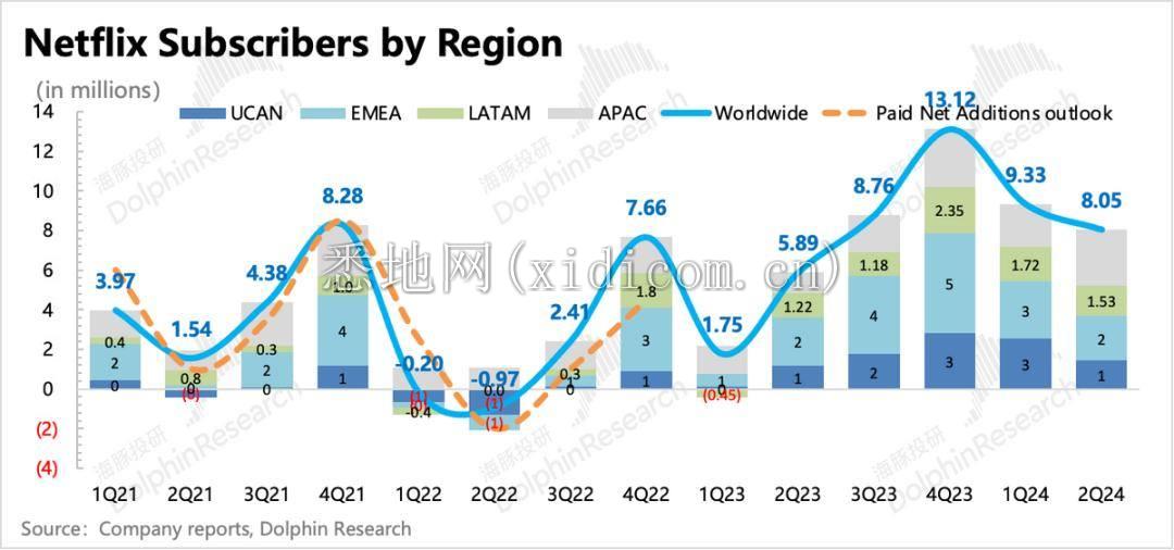 二季度订阅用户净增加805万,超出彭博一致预期的490万。不过头部机构最新预期已经拔高到600-700万,而投资者预期更高,希望增加800万以上,因此“超预期”的含金量就没那么高了。用户增加仍然是源于打击账户密码共享,和广告套餐的推出。