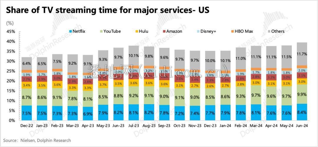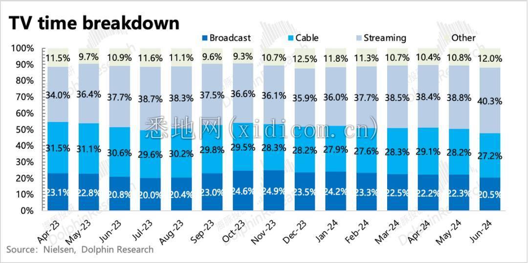 中长线上,主要的逻辑还是流媒体对有线电视的取代,以及奈飞在流媒体中保持竞争优势和行业突出地位。从Nielsen数据来看,二季度流媒体收视份额已经提升到40%,突破新高。