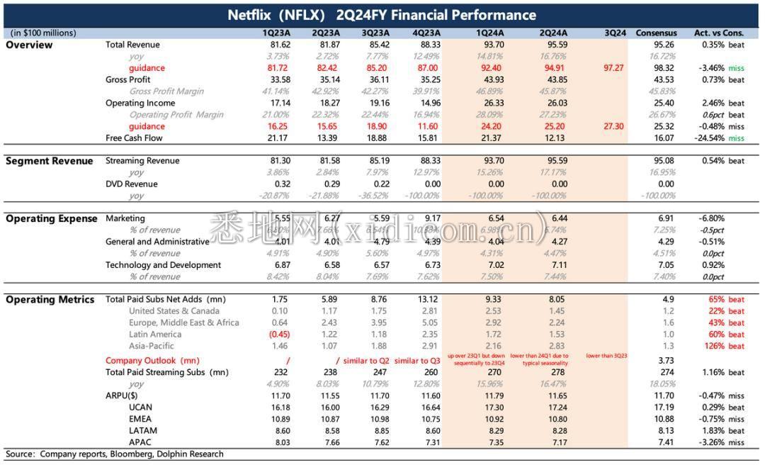 奈飞(NFLX.O)美东时间7月18日盘后发布了2024年第二季度财报:抗住了市场的高预期,奈飞交出了一份基本达标的成绩单。不过因为拥有定价权的买方预期原本就比较乐观,因此业绩发布后市场反应平淡。