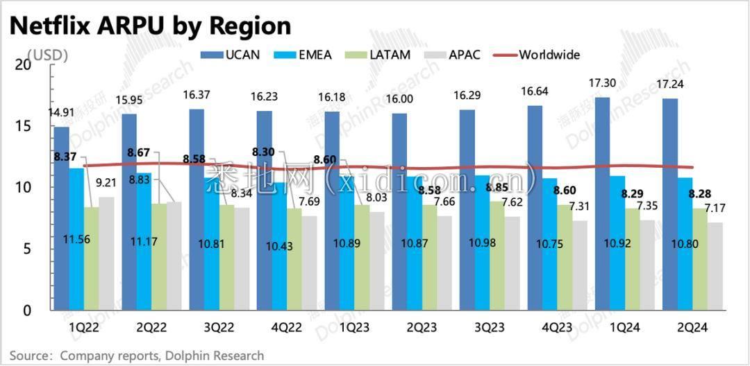 流媒体业务的增长主要还是靠用户规模拉动。虽然部分欧美地区近半年有过涨价,但从人均付费金额上来看,并不存在“表面上”的涨价效应,各地区除了拉美因为本身涨价幅度较大,ARPU还能勉强增长外,其他地区的ARPU都存在环比下降。
