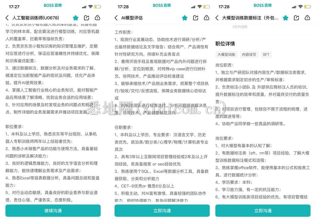 来源:Boss直聘中小米、百度、阿里巴巴集团的AI训练师招聘详情页截图