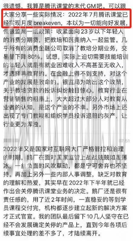 那就是某腾讯课程前员工说,直到2022年7月,腾讯课堂才实现月度的收支平衡,这还是在教培分期的前提下。