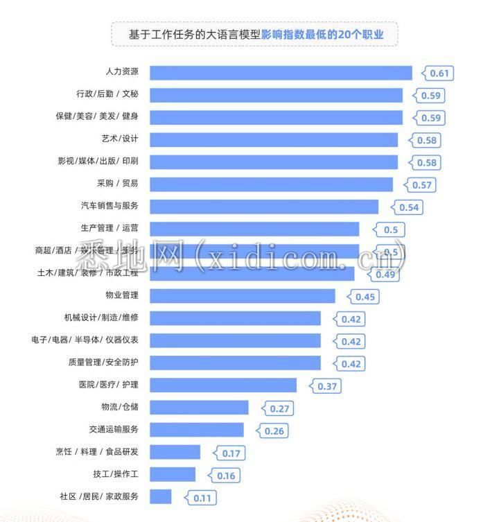 影响最低的职业,反而是人力资源、行政/后勤/文秘、美发健身、艺术设计等,往往是跟人打交道,或者与审美、艺术有关的岗位。
