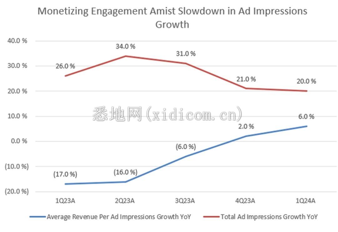 根据2024财年第一季度,Meta广告展示总数同比增长20%,广告收入同比增长27%,在AI推动下,每则广告展示的平均价格有所上涨,增长率为6%。
