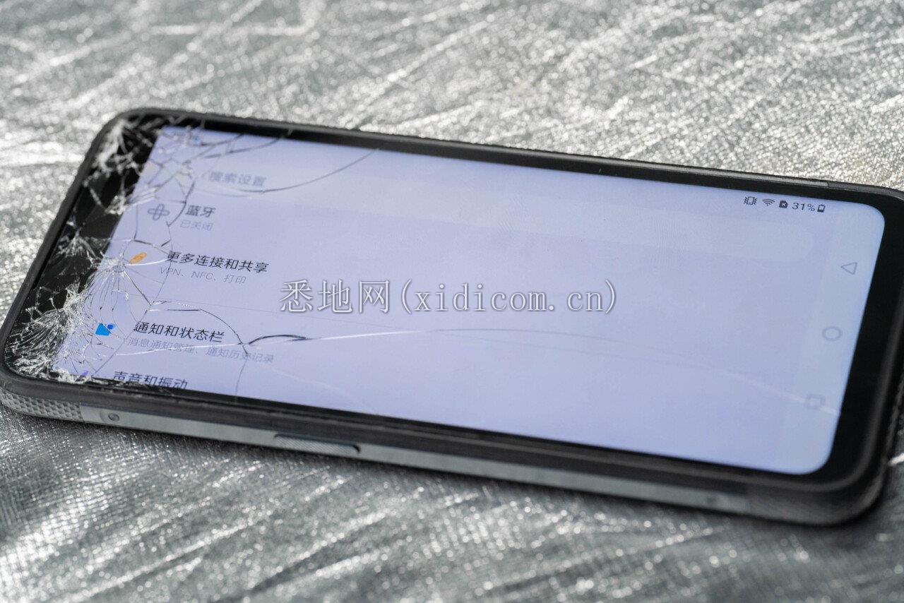 尽管发布会上 AGM 把 X6 用无人机从高空扔到了石头上,但在跌落测试中,AGM X6 还是因右上角触地导致屏幕还是碎裂。此外,屏幕上半部有部分区域显示颜色异常,显示屏内部组件可能受到了损伤。尽管 AGM X6 的结构设计强调了坚固耐用,但屏幕的抗冲击能力仍有提升空间。