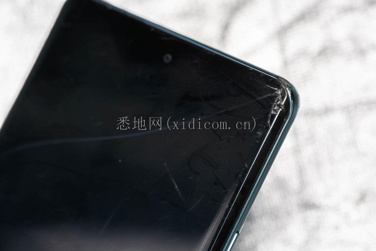 在测试中,OPPO A3 Pro 的右上角首先触地,导致屏幕破裂。在随后的滚动过程中,中框左下角也受到了严重磨损,屏幕表面出现了明显的划痕。虽然 OPPO A3 Pro 在一般的日常使用中表现良好,但在高强度跌落测试中,其曲面屏幕和中框的抗冲击能力表现不佳。