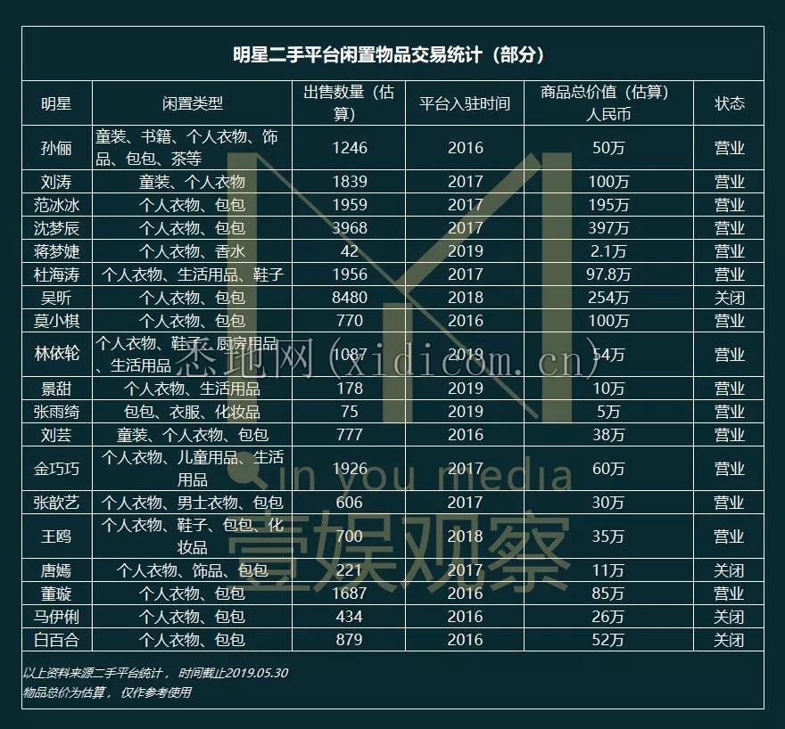 明星入驻二手平台出售个人闲置物品,早已不是新鲜事。粗浅估算了一下,仅闲鱼一个平台入驻明星就多达55位,入驻其他二手交易平台的明星也在60位左右。