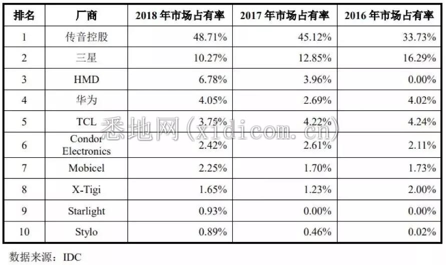 2015年,传音的手机出货量超过5000万部,在国内手机出口量中排名第一;此后的几年,其一直蝉联国产手机外销冠军。传音招股书也显示,根据IDC的统计数据,从2016年到2018年,传音在非洲市场出货量的市场占有率连续三年排名第一,分别为33.73%、45.12%和48.71%。