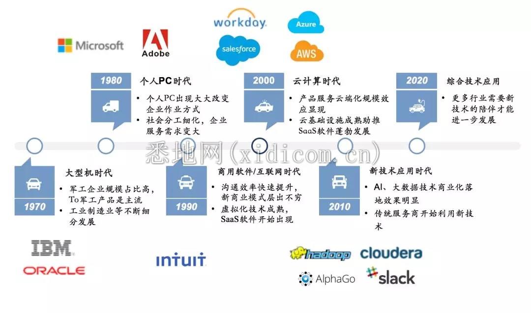 研究美国企业服务发展历史发现,美国企业服务发展伴随从工业化到信息化再到云化完整过程,稳步发展。主要分为大型机时代、个人PC时代、商用软件/互联网时代、云计算时代、新时代应用时代、综合技术应用。