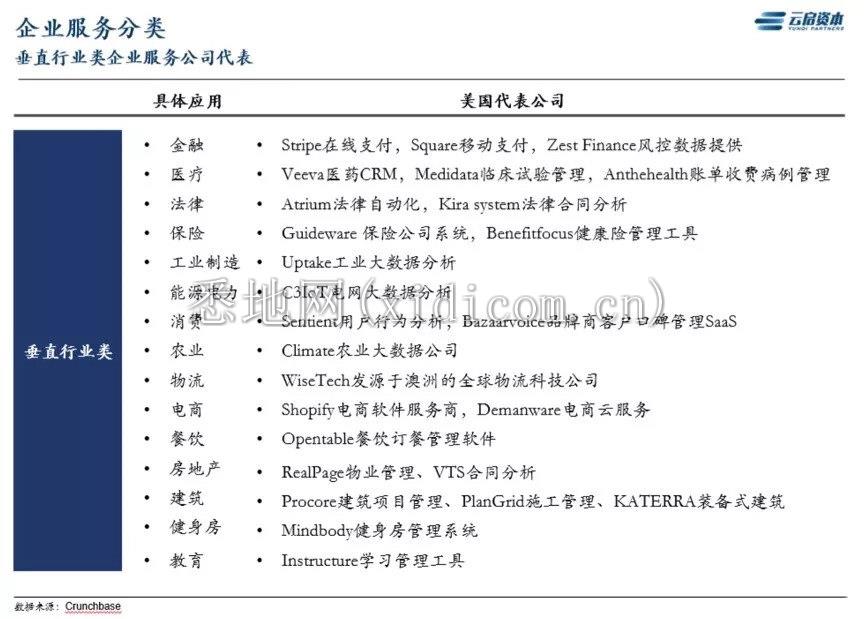 ● 从投资的角度看,企业服务分为业务管理、系统管理、数据分析、IT基础设施、通用服务、垂直行业服务六大类别,云启已经在IT基础设施和数据分析等领域深度布局。业务管理分为销售管理、营销管理、人力资源管理、采购供应链管理和财税管理等领域,行业从2015年开始发展已经有一部分公司出现,但行业格局仍旧较为分散,没有形成稳定格局。垂直行业服务包含安防、医疗、物流、法律、建筑、工业能源和保险金融,各行业具备较强特征。