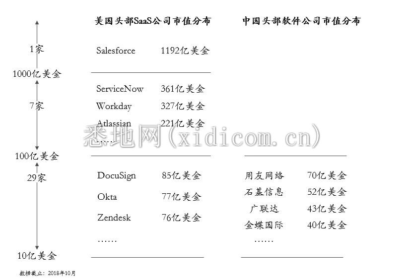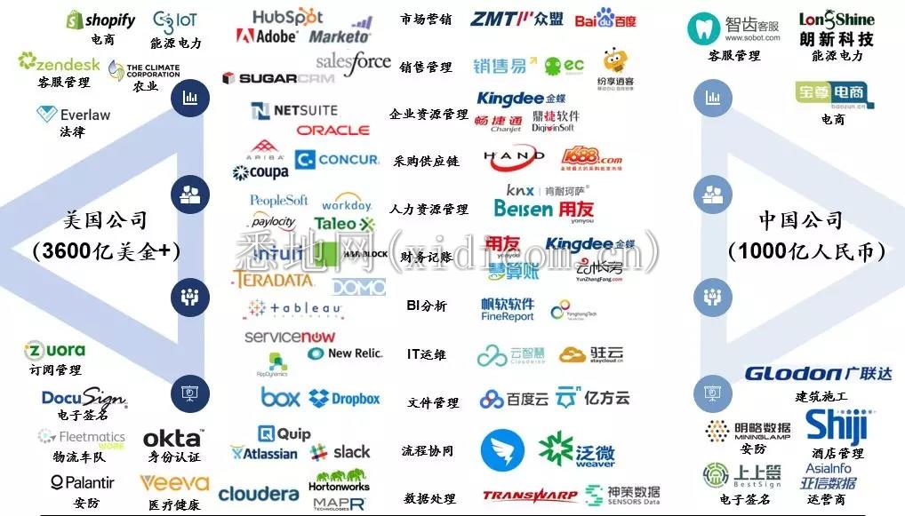 而在中美企业服务版图对比中,相比美国较为成熟的企业服务市场,中国在各领域都有公司出现,但无论是公司规模、产品质量上都存在巨大差距。