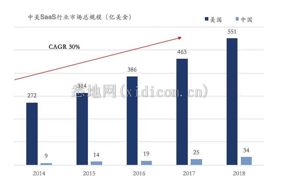 ● 2017年中国企业数3500万家,企业服务市场规模超万亿,相比美国而言,中国企业服务市场仍有很大发展空间。从SaaS产业角度分析,中国SaaS产业规模34亿美金,相比美国550亿左右美金市场规模还有较大的发展空间。从行业垂直细分情况看,相比美国,中国各个行业信息化技术改造尚未完成,行业效率有待进一步提升;