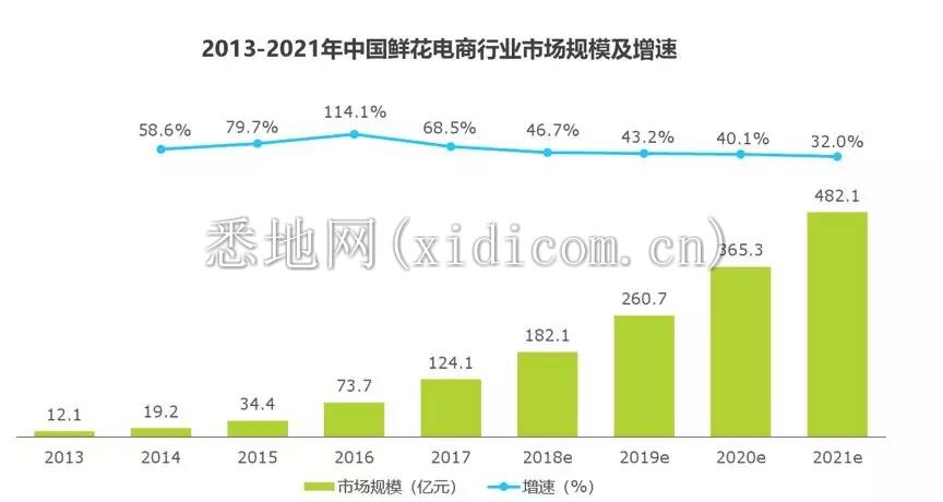 2013年-2021年中国鲜花电商行业市场规模及增速
