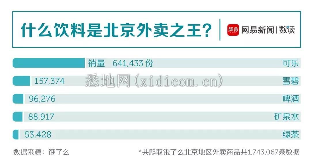 从饮料的外卖销量来看,啤酒确实发挥正常,但饮料届中的外卖之王还是被以绝对优势突出的可乐夺得,其后是雪碧、啤酒、矿泉水和绿茶。