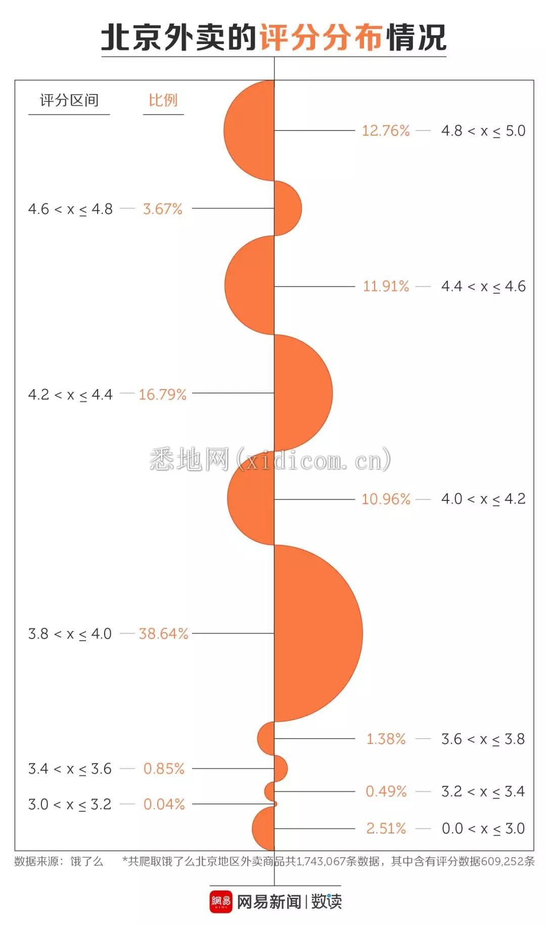 你在点外卖时可能有固定的高分店铺及商品选择,但整体来看,北京地区外卖的评分分布情况并不理想。近八成的外卖评分集中在3.8分至4.6分之间,其中占比最多的评分区间为3.8分至4分,比例为38.64%。