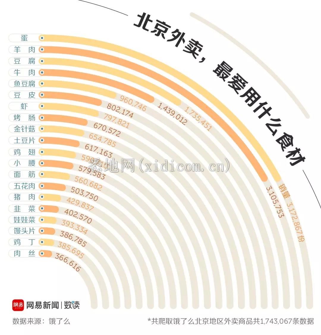 除了外卖菜品销量,数读菌还分析了这些外卖用到的食材。北京地区的外卖最爱用的食材是蛋和羊肉,外卖之王羊肉串功不可没,其次是豆腐、牛肉、鱼豆腐、豆皮和虾等,这些食材荤素搭配,仿佛又凑齐了一桌火锅或者烧烤。