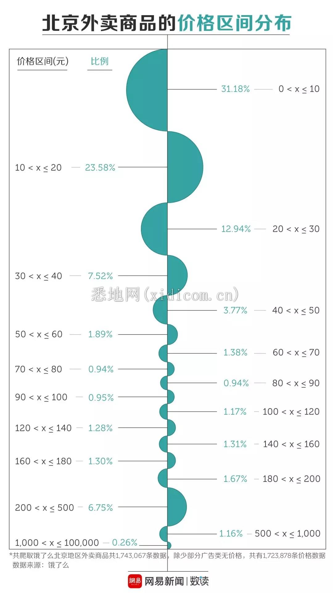 这样看来,近七成的外卖商品价格在30元以下,近八成的外卖商品价格在50元以下。从数据上来看,50元以上各价格区间的外卖商品所占比例较小。