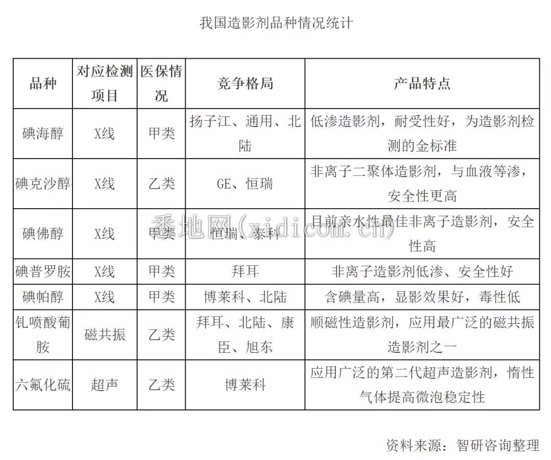 最后一类是医疗器械,包含医疗用橡胶衣着用品、医疗用α、β、γ射线设备、外科或兽医用家具及零件等,其中医院一般用量较大的是X光造影剂。市场主要的厂家中只有美国通用和德国拜尔是外企,其他几家都是国内企业。
