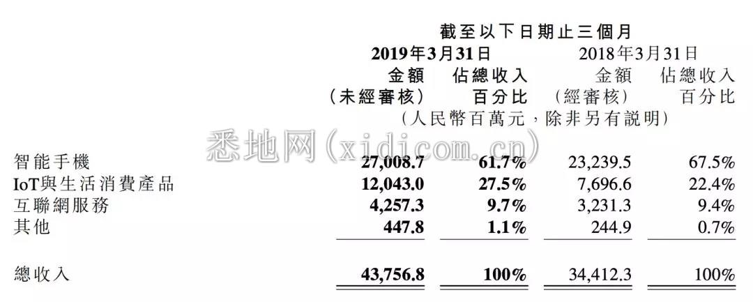 其中,智能电视业务连续两个季度出货量居中国市场份额第一,截至2019年3月31日,全球累计出货量为260万部,同比增长99.8%。报告期内,小米的互联网分部收入达人民币43亿元,同比增长31.8%。其中,广告业务收入达人民币23亿元,同比增长21.8%。游戏收入达人民币8.2亿元,同比增长6.8%。