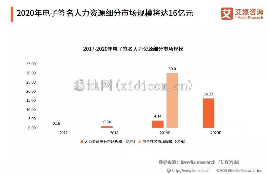 近日,国内知名知名数据调研机构艾媒咨询,针对人力资源场景下电子签名应用市场状况发布了《2018中国人力资源场景电子签名应用市场研究报告》。报告显示:“2018年中国电子签名人力资源市场规模已达到0.94亿元,预计到2020年,人力资源细分市场规模将达到16.22亿元。”