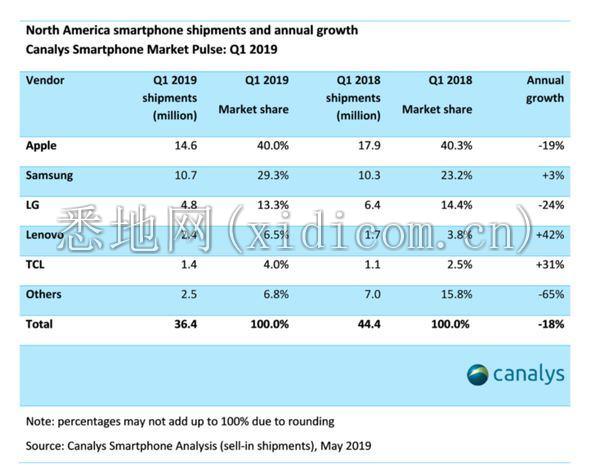 根据第三方调研机构Canalys发布的最新市场调研数据显示:2019年第一季度,北美智能手机总出货量为3640万台,比去年同期的4440万台出货量少了800万台。报告指出,其中主要原因是长期处于北美手机市场销量冠军的苹果手机,出货量大幅下滑。