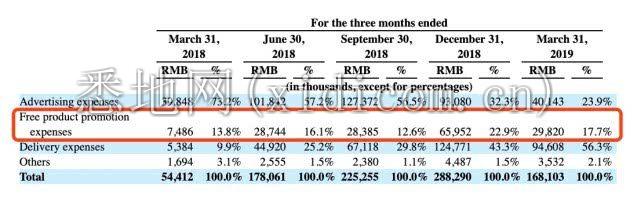 运营成本方面,2019年第一季度的运营成本为1.01亿元,相比上年同期的1381万元增长了755%。其中占据运营成本较大的项目为销售和推广费用、店面租赁和运营成本、原材料成本、管理费用。