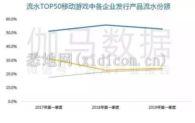而看2019年第一季度,收入TOP50移动游戏中,腾讯与网易发行的产品数量占比均出现下降,其他企业份额则出现回升。尤其是,目前用户数据表现最好的《刺激战场》,此前并没有商业变现的机会,极大压缩了腾讯游戏营收增长的空间。