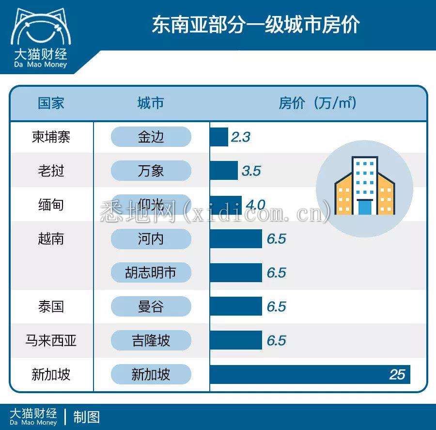 根据地产商的一份宣传资料显示,“泛亚高铁”项目的触角可以伸到的国家中,都是房价即将腾飞的区域,但也都已经不便宜,作为“价值洼地”的金边,其房价也到了2.3万/㎡,就更不用说全球房价排在前三的新加坡了。